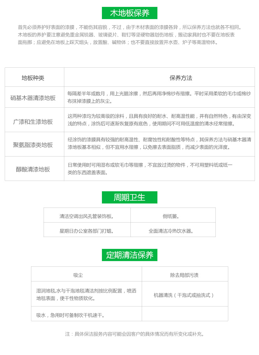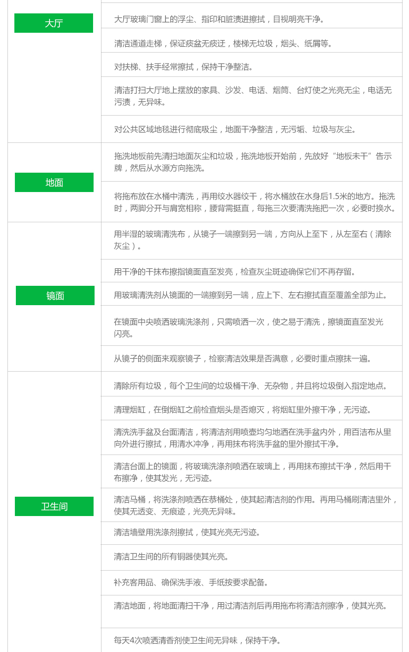 人員按程序、有計(jì)劃地對(duì)指定區(qū)域全天或定期地進(jìn)行清潔養(yǎng)護(hù)。