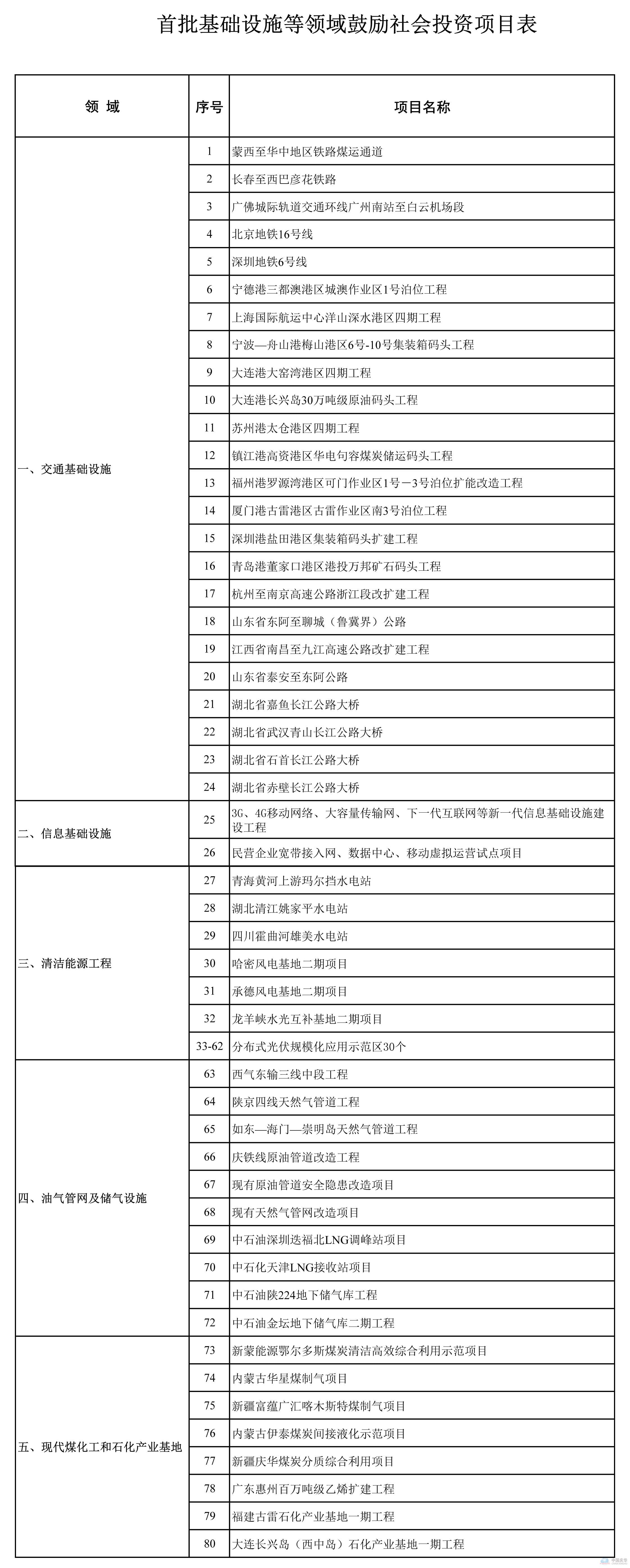 一、首批推出的基礎(chǔ)設(shè)施等領(lǐng)域鼓勵社會資本參與的80個項(xiàng)目涵蓋鐵路、公路、港口等交通基礎(chǔ)設(shè)施,新一代信息基礎(chǔ)設(shè)施,重大水電、風(fēng)電、光伏發(fā)電等清潔能源工程,油氣管網(wǎng)及儲氣設(shè)施,現(xiàn)代煤化工和石化產(chǎn)業(yè)基地等方面,鼓勵和吸引社會資本特別是民間投資以合資、獨(dú)資、特許經(jīng)營等方式參與建設(shè)及營運(yùn)。