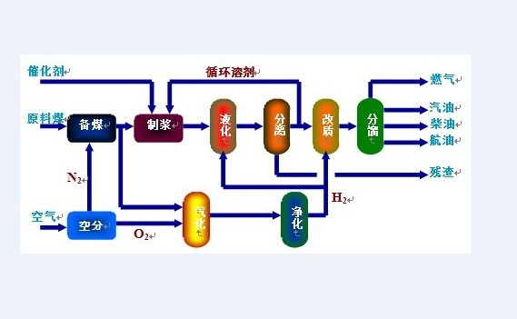 煤直接液化,將煤在氫氣和催化劑作用下通過(guò)液化生成粗油,再經(jīng)加氫精制轉(zhuǎn)變?yōu)槠?、柴油等石油燃料制品的過(guò)程,因液化過(guò)程主要采用加氫手段,故又稱煤加氫液化法。煤直接液化典型的工藝過(guò)程主要包括煤的破碎與干燥、煤漿制備、催化劑制備、氫制取、加氫液化、固液分離、液體產(chǎn)品分餾和精制,液化大規(guī)模制備氫氣通常采用煤氣化或者天然氣轉(zhuǎn)化。